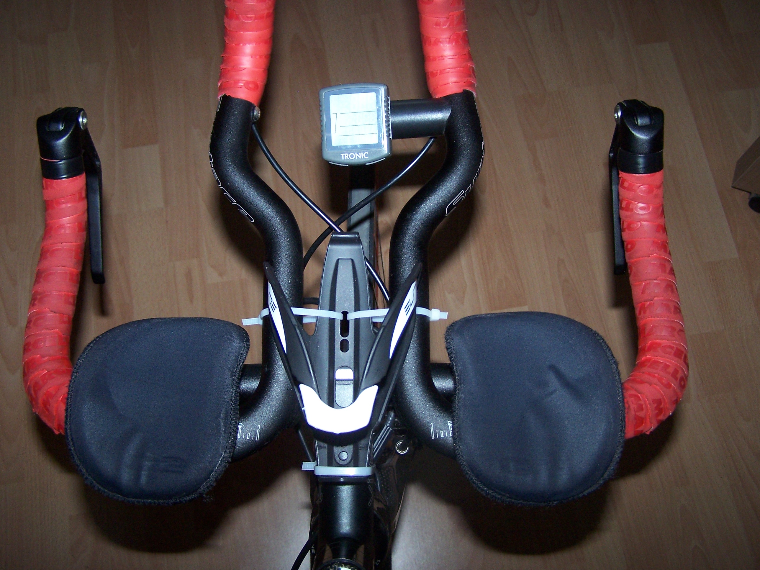 Nach langem Hin und Her, wo und wie ich die Gels am Rad deponiere und so meine Kohlenhydrataufnahme bei den 180@Roth am 18.07.2010 exakt bewerkstellige, habe ich nun folgendes vor. Die Nutrixxion Gels werden in eine transparente 550 ml Flasche gefüllt, verdünnt bis die Flasche voll ist und in einem neuen, am Vorbau montieren Elite Custom Race Trinkflaschenhalter transportiert. Der Trinkflaschenhalter ist mit drei Kabelbindern am Vorbau und Auflieger fixiert