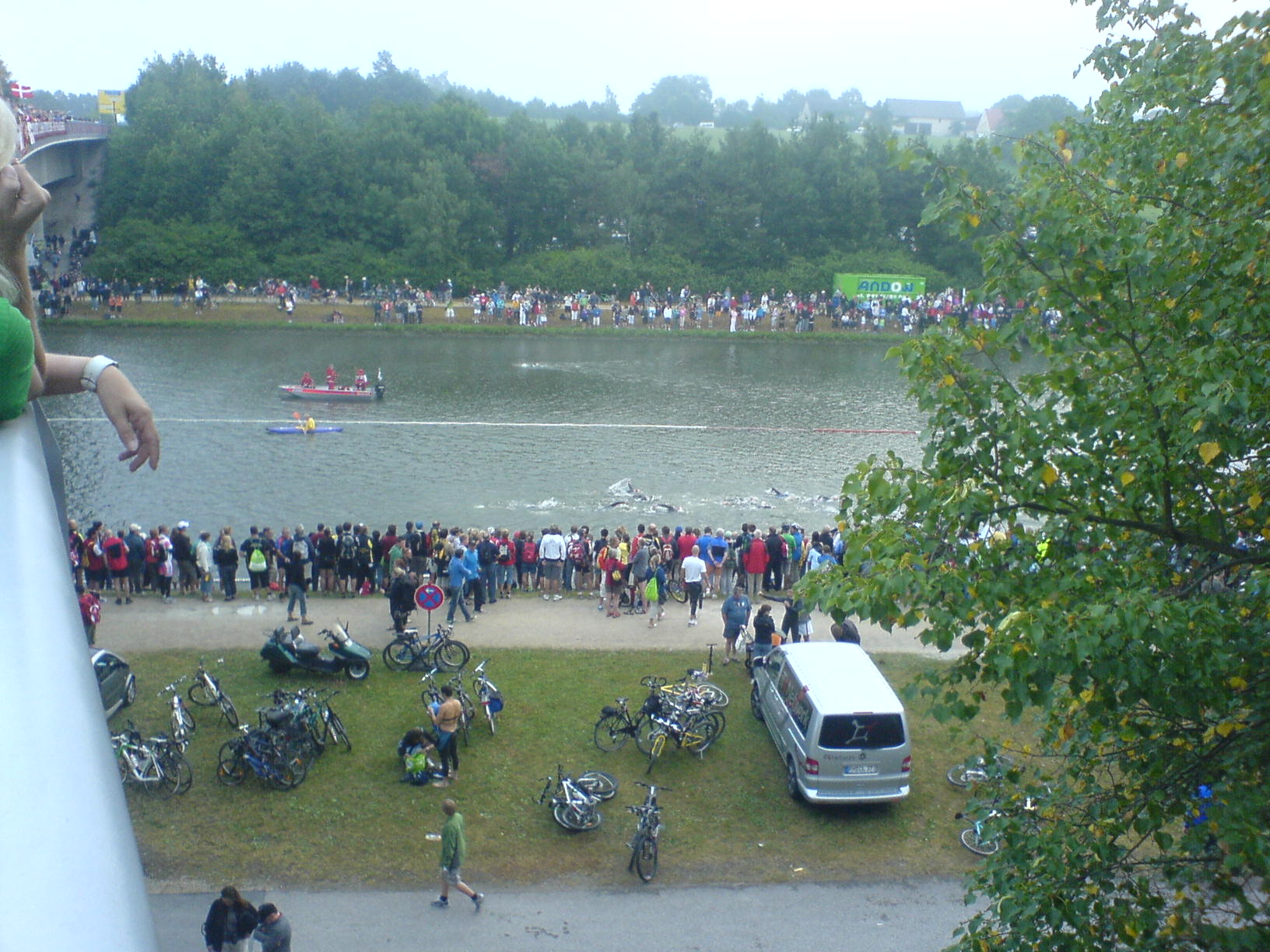 Ich lief über die mit Zuschauern übersähte Brücke und hörte den Sprecher ansagen, dass bald die ersten Schwimmer kämen. Ich sah dann die ersten aus dem Wasser kommen und auch auf dem Rad an mir vorbeikommen. Danach traf ich mich am Ende der Brücke mit Florian, unserem Staffelschwimmer. Wir mümmelten uns dann im Gewühl der vielen Zuschauer und Wettkämpfer in die Wechselzone. Dort ging es bei den Stafflern noch recht gemächlich zu.