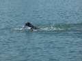 Endlich angekommen, wollte ich mich mit Bademütze und Brille ausgerüstet noch etwas abseits vom Trubel einschwimmen. Also am besten ganz links, wo keiner ist. Ich sah dann Richtung Startfeld und wurde gewahr, dass der Start wohl ohne mich erfolgt ist. Gehört habe ich jedenfalls nichts von einem Schuß. Egal, ein supi Schwimmer wie ich hat nun endlich Platz für raumgreifende Armbewegungen. Es hat dann wohl fast die Hälfte der Strecke von 400 Metern (korrekt wären für mich natürlich 450 Meter, aber das wird natürlich in der Liste nicht honoriert...*g*) bedurft, bis ich endlich überhaupt mal das Ende des Feldes erreicht hatte. Nun letzter wollte ich wirklich nicht sein. Es gelang wohl auch.