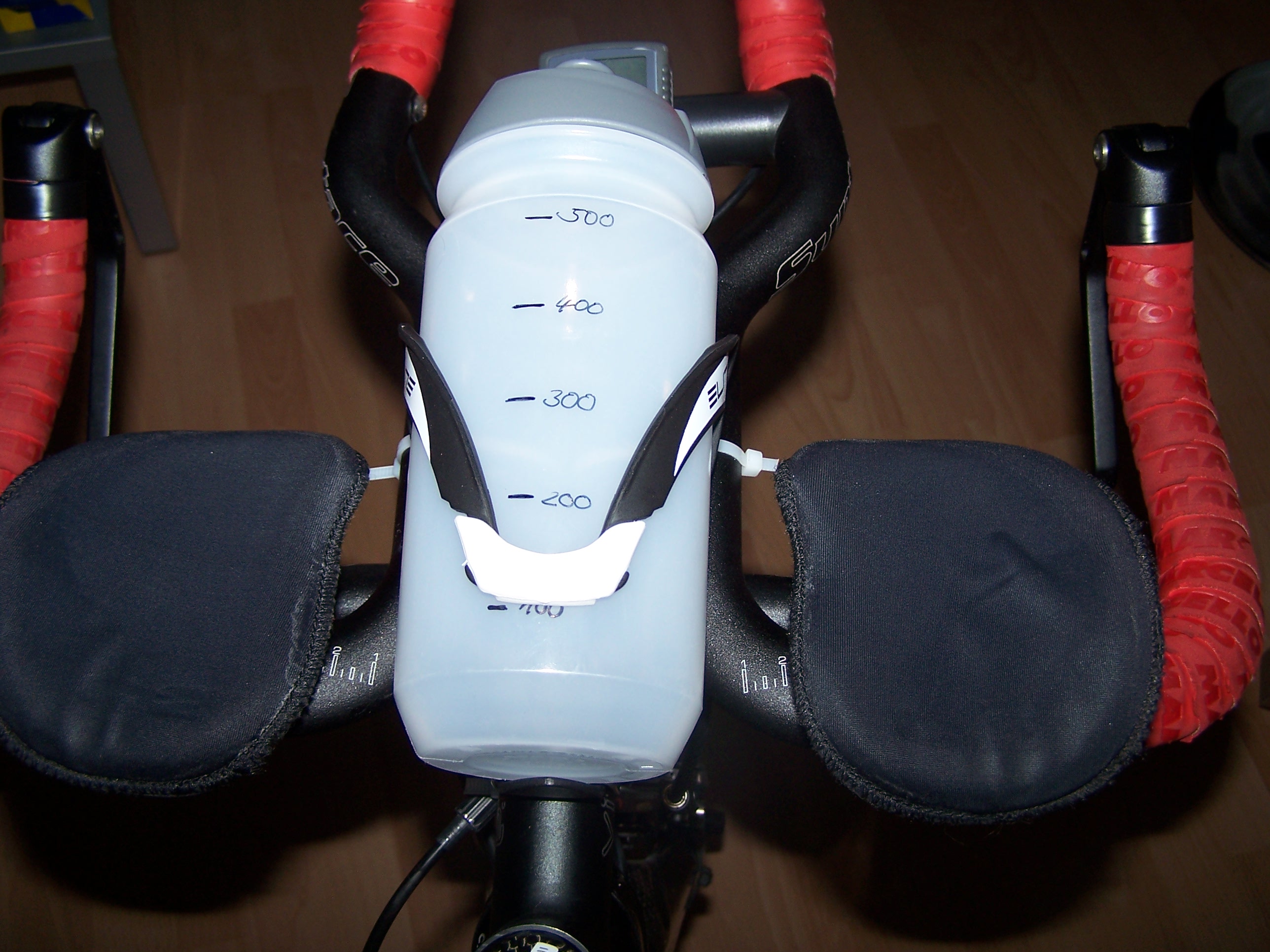 Nach langem Hin und Her, wo und wie ich die Gels am Rad deponiere und so meine Kohlenhydrataufnahme bei den 180@Roth am 18.07.2010 exakt bewerkstellige, habe ich nun folgendes vor. Die Nutrixxion Gels werden in eine transparente 550 ml Flasche gefüllt, verdünnt bis die Flasche voll ist und in einem neuen, am Vorbau montieren Elite Custom Race Trinkflaschenhalter transportiert. Der Trinkflaschenhalter ist mit drei Kabelbindern am Vorbau und Auflieger fixiert