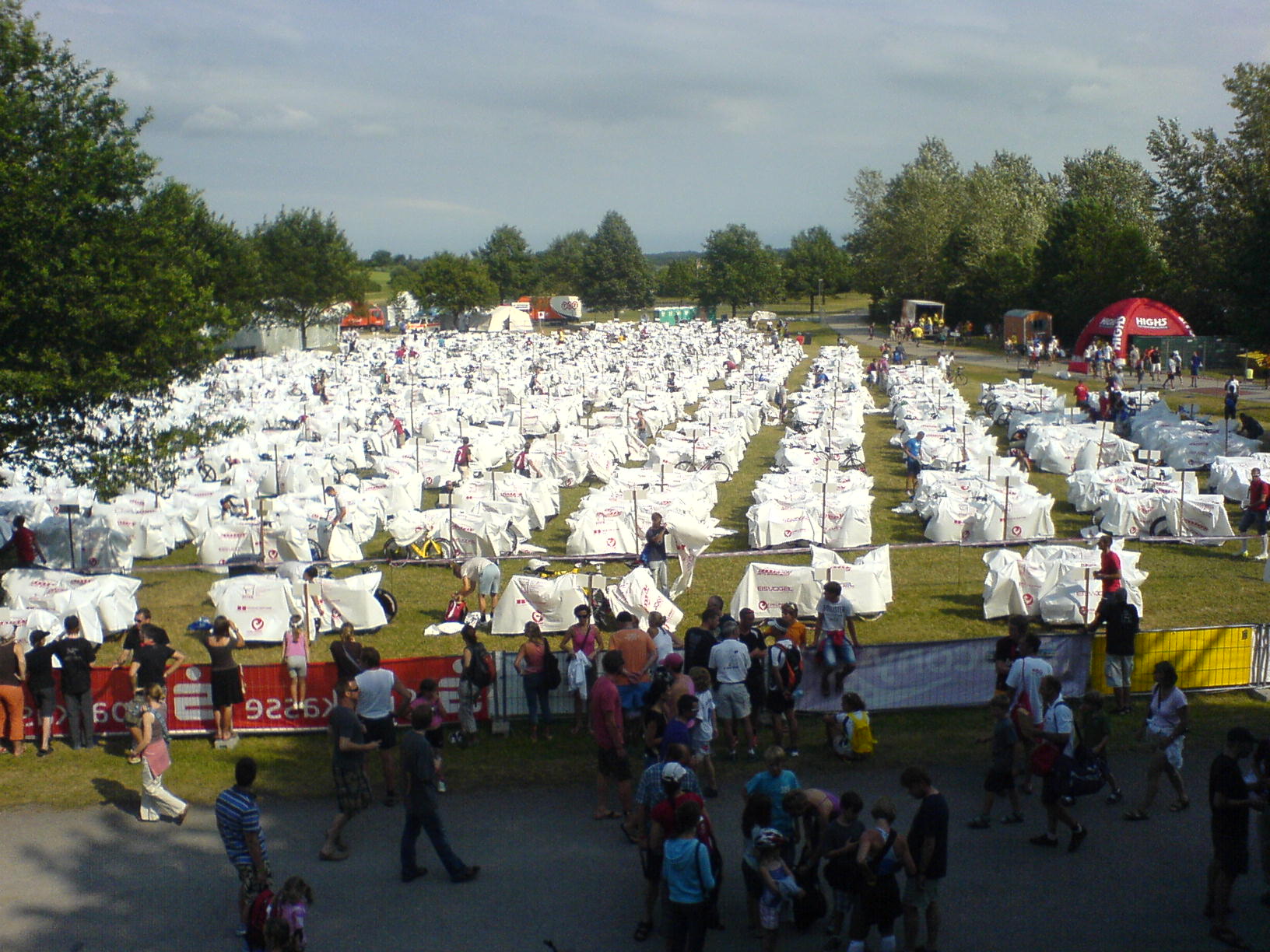 Ich lief über die mit Zuschauern übersähte Brücke und hörte den Sprecher ansagen, dass bald die ersten Schwimmer kämen. Ich sah dann die ersten aus dem Wasser kommen und auch auf dem Rad an mir vorbeikommen. Danach traf ich mich am Ende der Brücke mit Florian, unserem Staffelschwimmer. Wir mümmelten uns dann im Gewühl der vielen Zuschauer und Wettkämpfer in die Wechselzone. Dort ging es bei den Stafflern noch recht gemächlich zu.